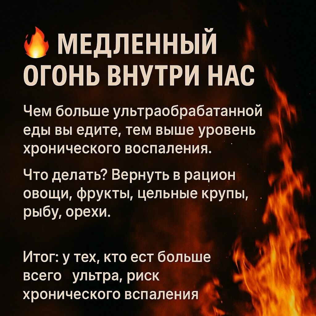 Ваш организм может тлеть изнутри — без боли и заметных сигналов. Учёные из Университета Флориды доказали: чем больше на тарелке ультраобработанной еды, тем выше уровень хронического воспаления.