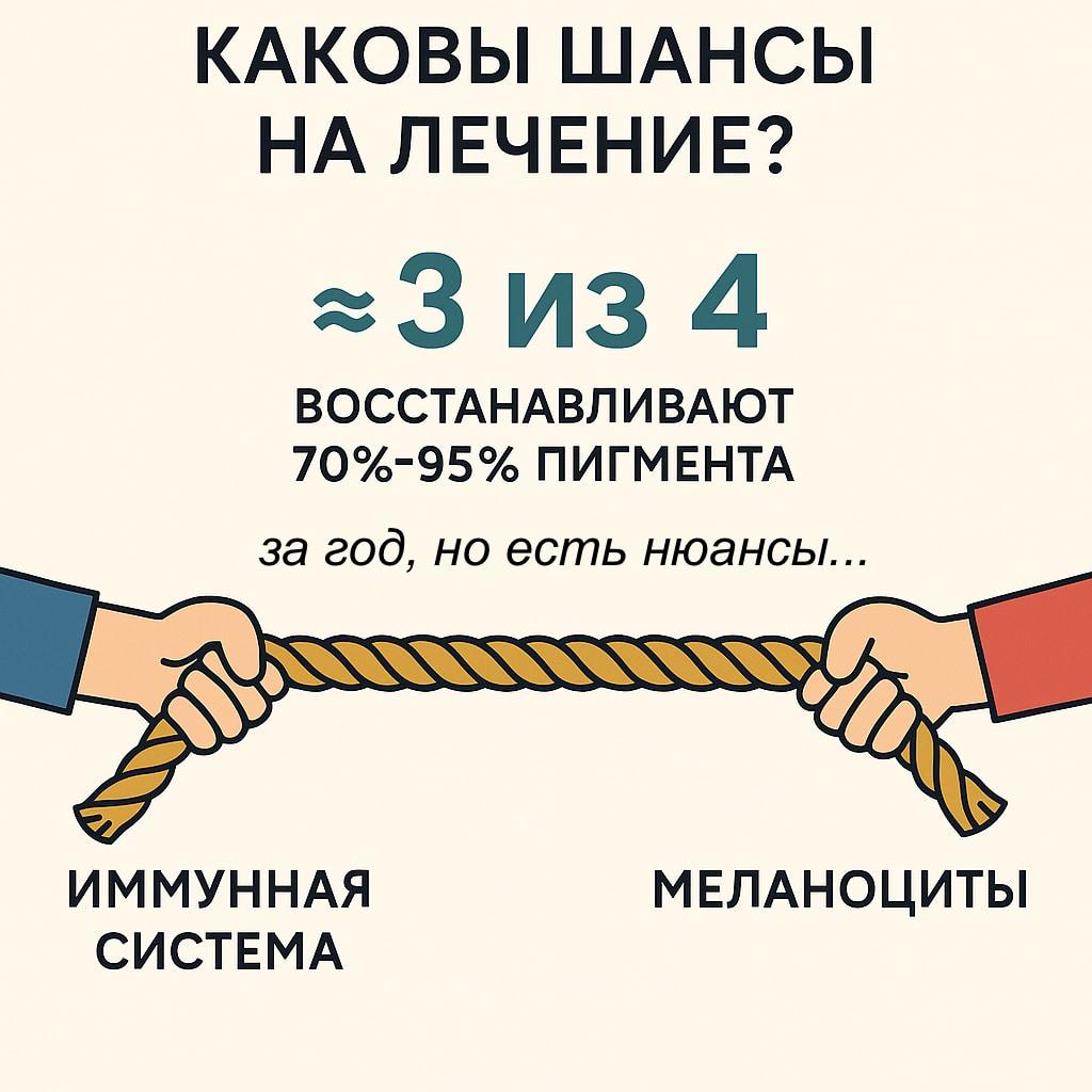 Но даже после успеха примерно у половины пациентов пятна возвращаются через 3–5 лет. Это не провал терапии, а «правила игры» — перетягивание каната между иммунитетом и пигментом.